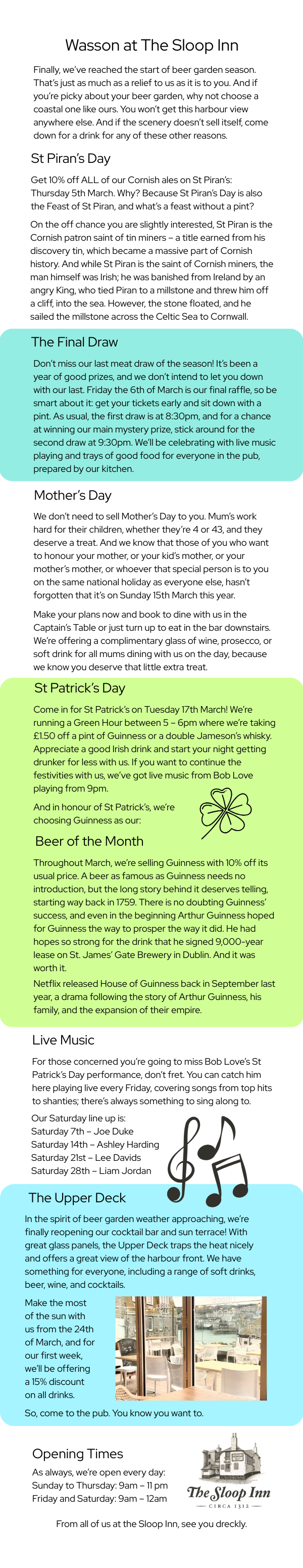 Welcome to the Sloop InnWinter Breaks Special – 30% Off Accommodation! Two Nights Stay...Whether you're escaping the chill or enjoying the peaceful charm of St Ives in the off-season, it's the perfect time to relax and save.Book NowWasson Click here to find out!!!Mothers Day!Mother’s Day is just around the corner — secure your booking @ The Captains Table!ACCOMMODATIONView Rooms & BookFood & DrinkFeeling Hungry?Web CamerasWatch LIVE
